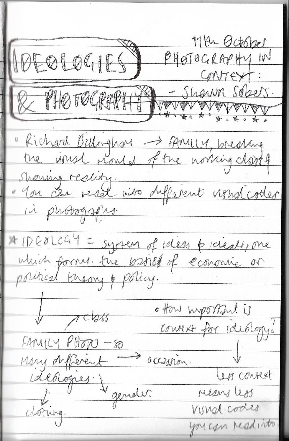 3) Ideologies and Photography, Shawn Sobers - 11/10/17Oct 21, 20171 min readShawn did our next Photography in Context lecture, this week talking about ideologies in photography. My notes from the session can be seen below. #photographyincontext